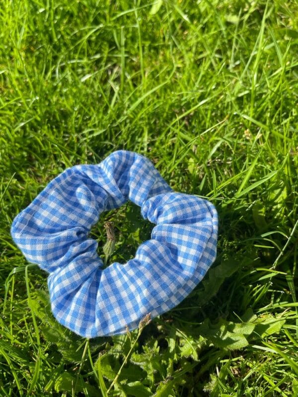 + Free ShippingA bold blue and white gingham patterned scrunchie